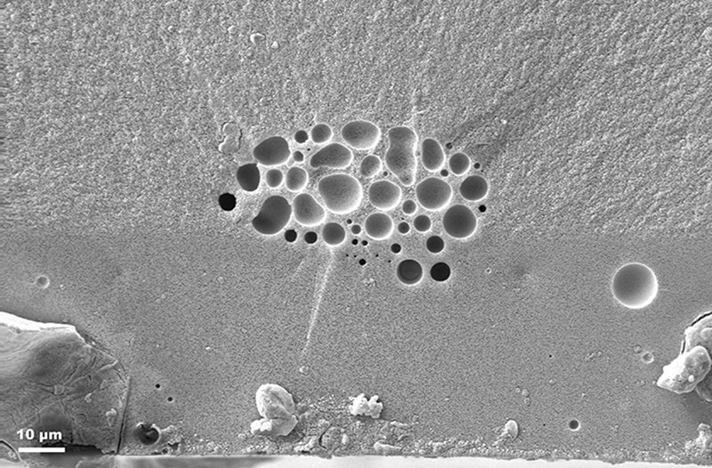 The photo shows a cluster of pores responsible for fracture of a glazed lithium disilicate material. „The cluster of bubbles reminds us of the human brain.“